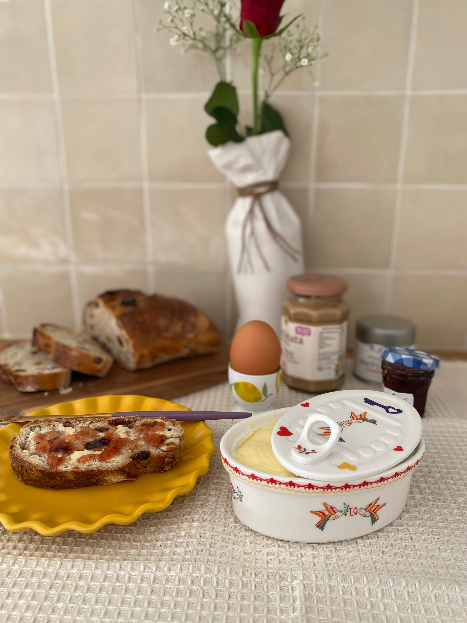 Son décor coloré apporte une touche artisanale et chaleureuse à la table du petit-déjeuner.