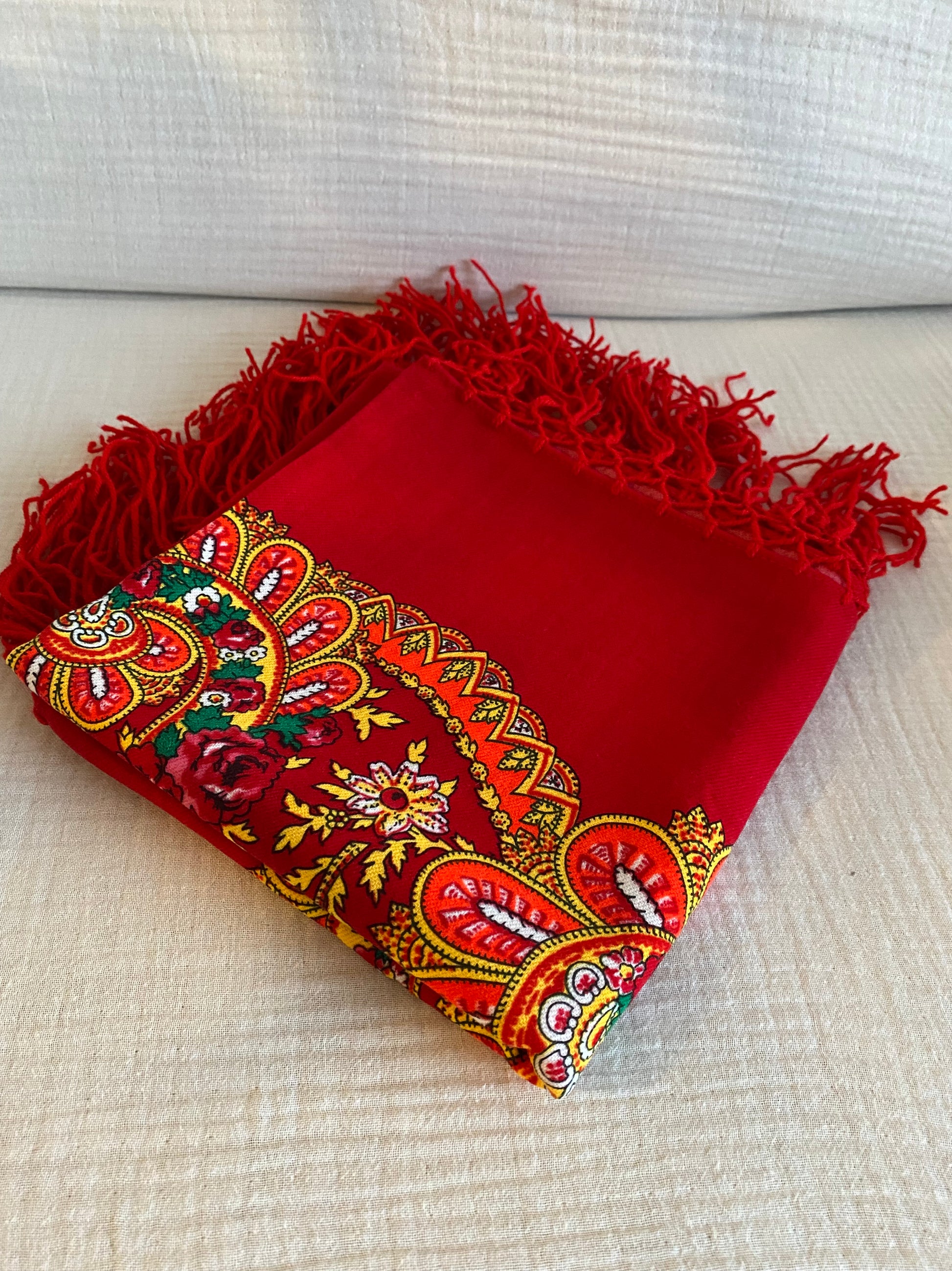 Écharpe folklorique aux motifs traditionnels et aux couleurs vibrantes.